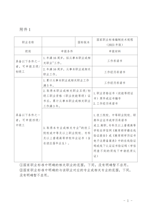 3.申报材料:符合《国家职业标准编制技术规程(2023年版)》中相应等级申报条件的考生,可报名参加职业技能等级认定。具体申报条件及需提交的申报材料见附件1。